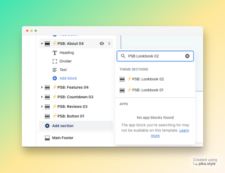 Go to "Theme Customize", select "Add section". The section after installing from Puco Sections will appear in the theme, starting with the symbol "⚡︎PSB" to distinguish it from the rest.